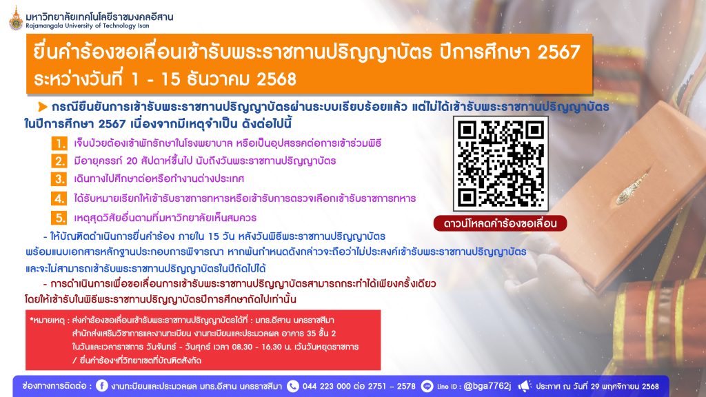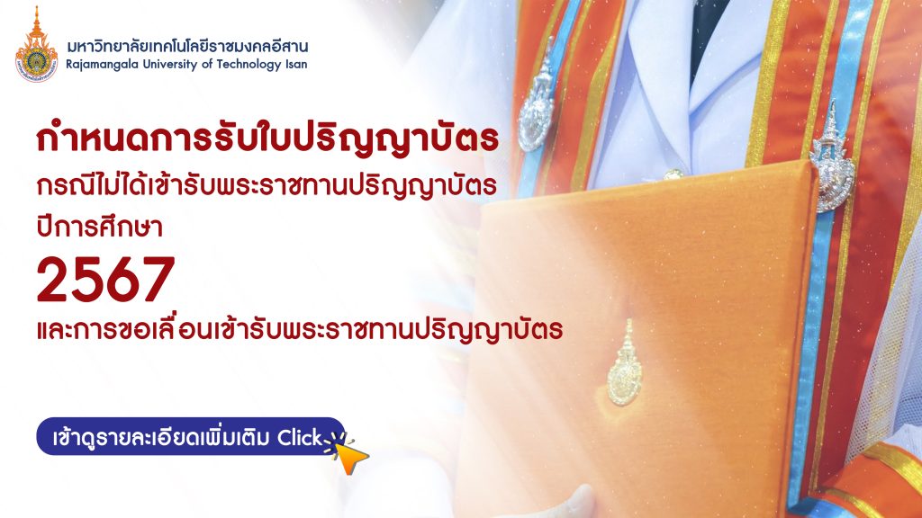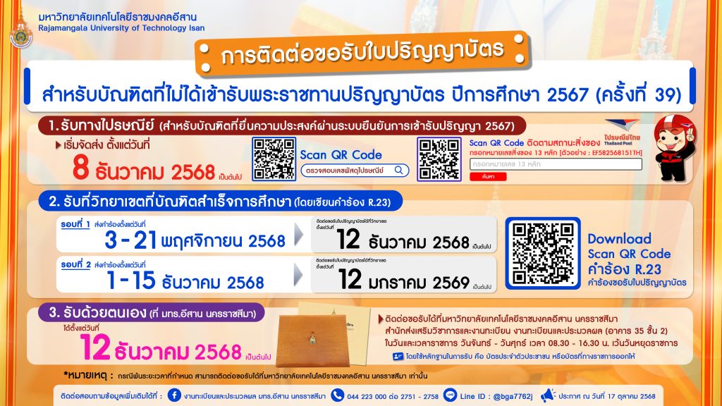 Posted inข่าวสำเร็จการศึกษา การรับใบปริญญาบัตรกรณีไม่ได้เข้ารับพระราชทานปริญญาบัตร ปีการศึกษา 2567 16 ตุลาคม 2025